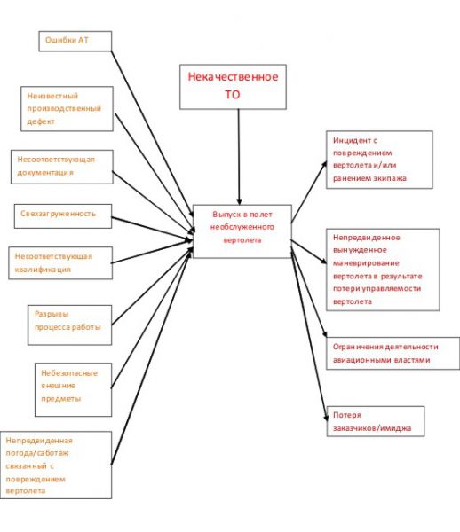Далее, для каждой из угроз, производится выбор соответствующего наиболее вероятного рискового события, которое может состояться в ходе подготовки и выполнения полетов. На каждое наиболее вероятное рисковое событие составляется список действий персонала, которые могут привести к обозначенному событию и с другой стороны, список последствий, к которым может привести возникновение события связанного с данной угрозой.