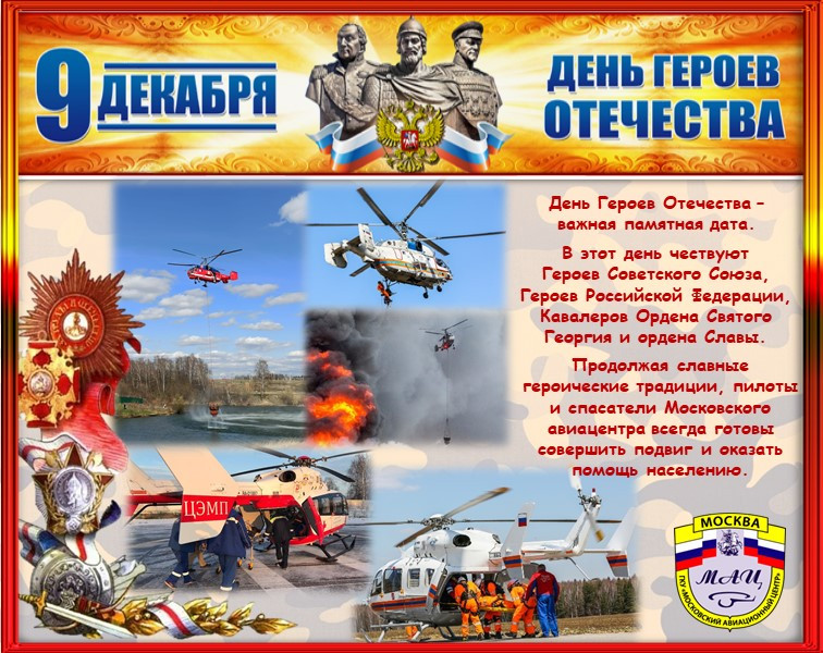 Московский авиационный центр поздравляет с Днем Героев Отечества сотрудников пожарно-спасательного гарнизона и всех, кто каждый день помогает людям и спасает жизни, продолжая героические традиции своих предков.