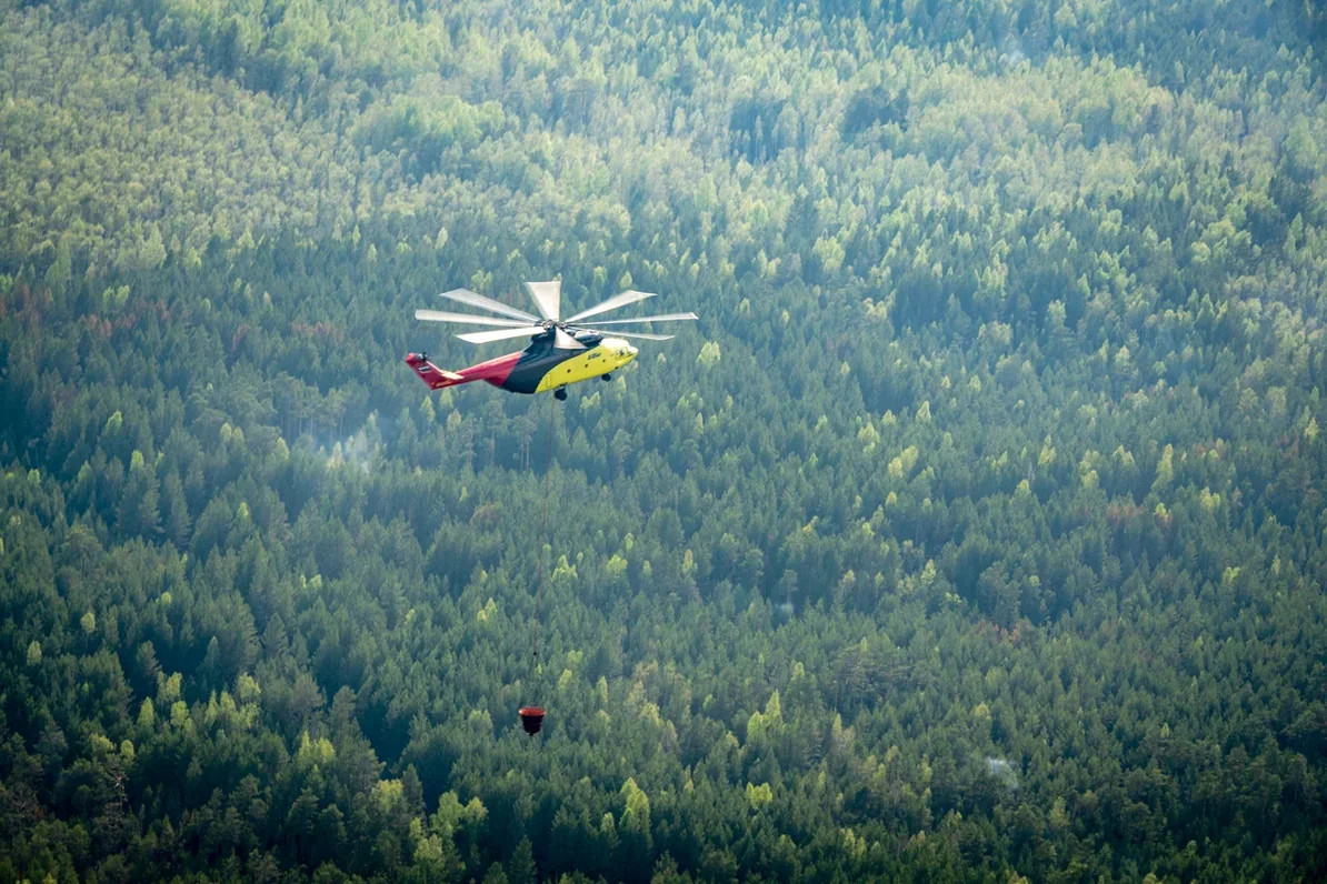 Ми-26 — крупнейший вертолет в мире — способен менее чем за минуту сбросить 15 тонн воды. Новейший Ми-8АМТ может поднять до 4 тонн воды и выполнить точный сброс на очаг возгорания.